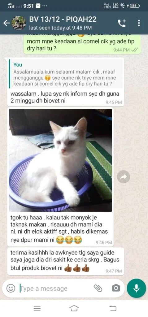 Vitamin Biovet ni memberi kesan seawal 6 – 12 jam bergantung kepada sistem imun kucing.